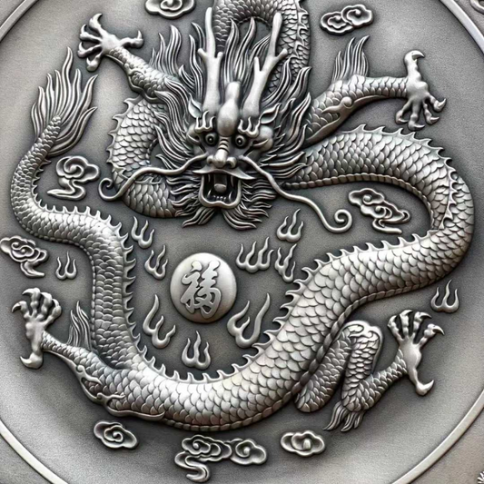 Sale price $23,558.00 AUDProduct Description Embodying the power and elegance of the Chinese Dragon, this Sterling Silver Dragon Plate is a stunning piece of artistry and craftsmanship. Featuring intricate 3D relief craftsmanship, the plate showcases the dragon in all its majesty, surrounded by clouds and flames, making it a powerful symbol of strength, prosperity, and transformation. The dragon is a prominent symbol in Chinese culture, representing good fortune,... -