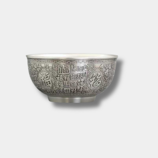 Sale price $958.00 AUDProduct Description The Sterling Silver "Hundred Blessings" Bowl is a stunning piece of artistry crafted from 999 pure sterling silver. This bowl features intricate engravings of the Chinese character for "Fu" (福), meaning blessings, which is repeated throughout the design, symbolizing abundance, prosperity, and good fortune. The ancient patina finish adds a unique, vintage charm, giving it the appearance of a rare heirloom passed down... -