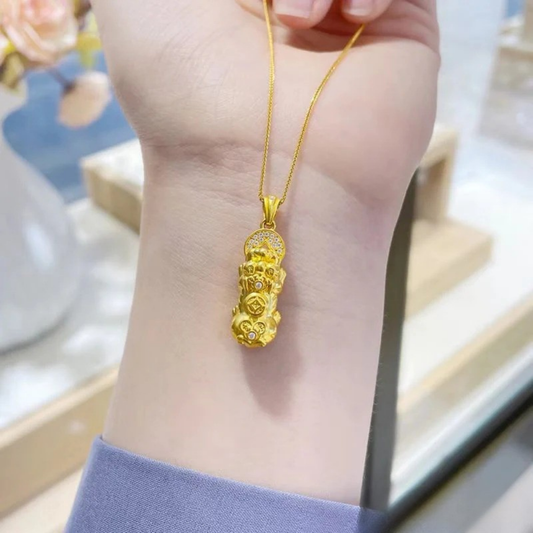 Sale price $878.00 AUDProduct Description This Lucky Pi Xiu Pendant combines modern elegance with ancient cultural symbolism. Crafted with Moissanite stones, renowned for their brilliance and ethical sourcing, this pendant features a hollow design with a coin pattern and a Pi Xiu, a mythical creature known for its ability to attract wealth and prosperity. The Pi Xiu, often depicted biting a coin, is believed to safeguard wealth and bring... -